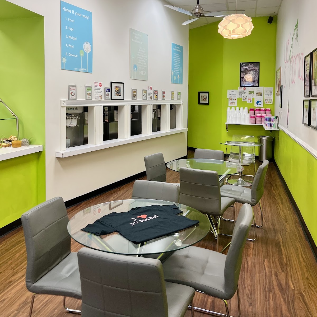Friendly staff, clean location. I admit they are often playing Peppa Pig on a TV for kids, but they do have a nice seating area with a mix of chairs and couches. They often have the radio playing with Peppa Pig and I admit the overlapping can be a bit odd, but since I'm usually chatting with a friend, it isn't too jarring. They have boba, smoothies and snow cones, but the star is the froyo. They rotate flavors weekly, I'm a basic witch and like the vanilla, which is always on tap. My friends favorite is the watermelon, with strawberry a close second. He often buys the prepacked pints to take home. I like the toppings on offer (fruit, nuts, boba, brownies and more). And when we want froyo, we head to Yo Mama.