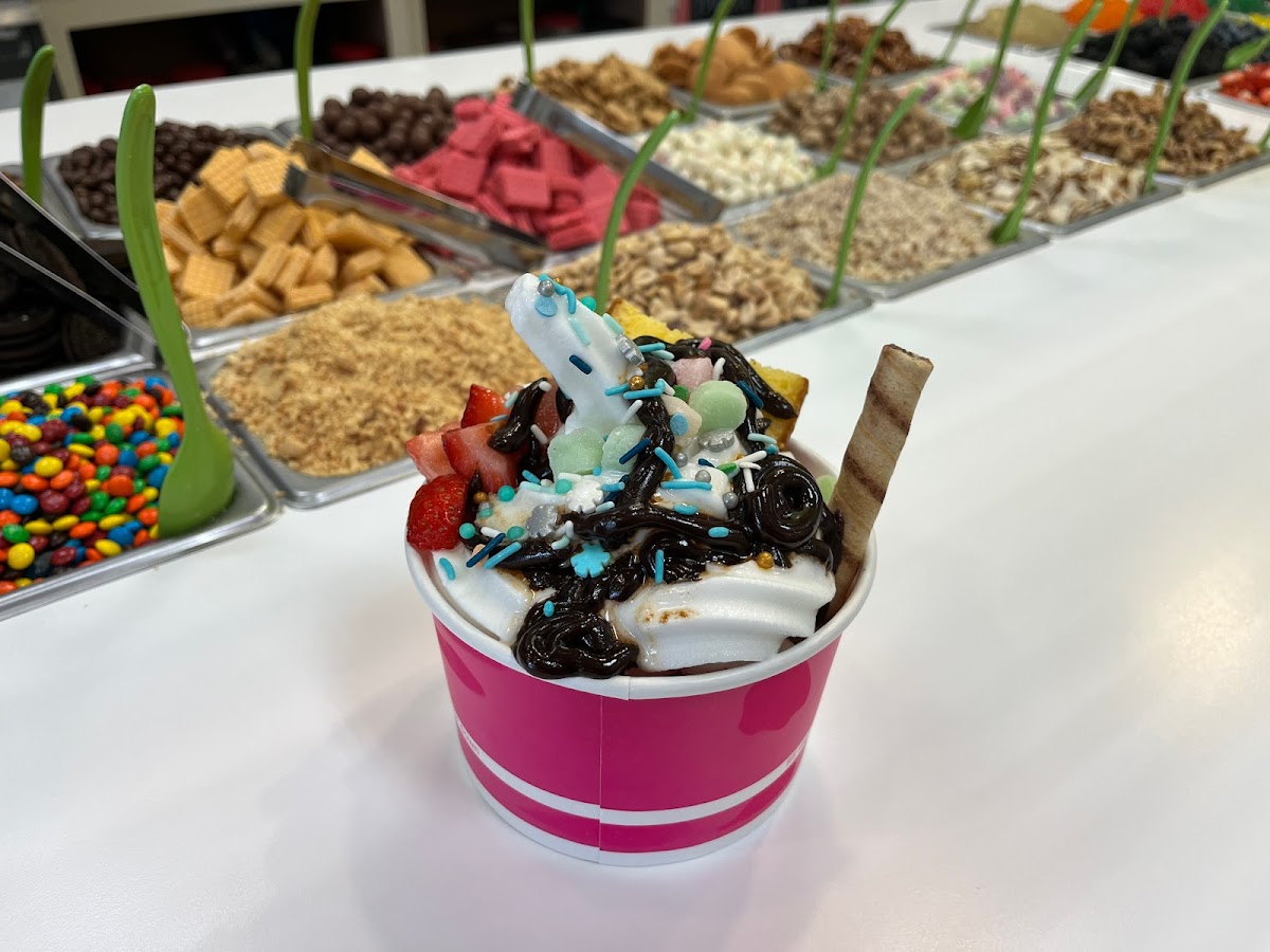 Cute place, little pop music in the background and plenty of options for your sweet treat cravings. There was a large variety of toppings to choose from. Priced by the ounce and 15% discount for military/first responders is a plus. Self serve with helpful/friendly staff if needed. Only four star due to parking lot being packed which may only be due to time of visit.